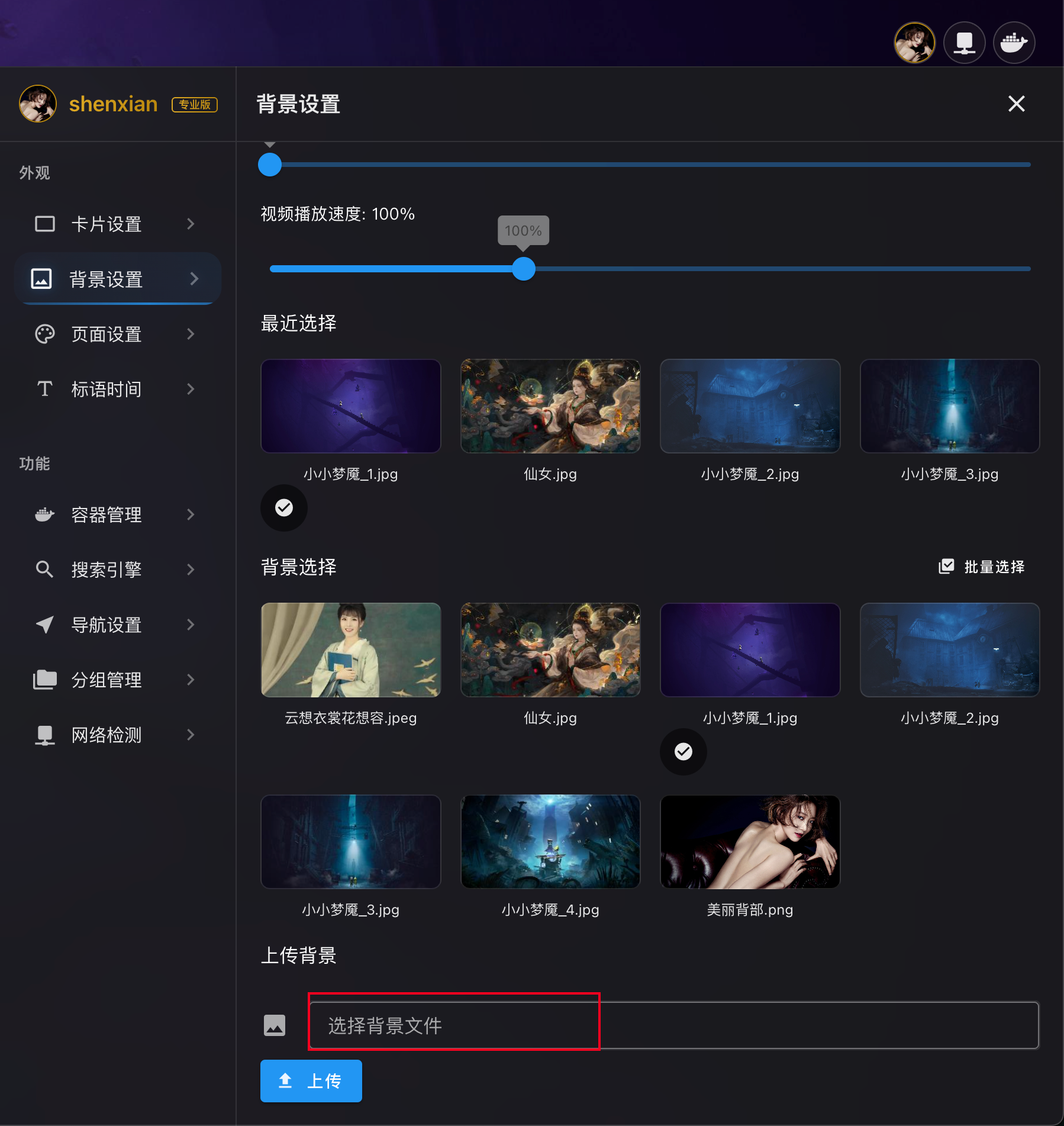 - 上传新背景:点击"上传"按钮,选择图片或视频文件(支持批量上传)