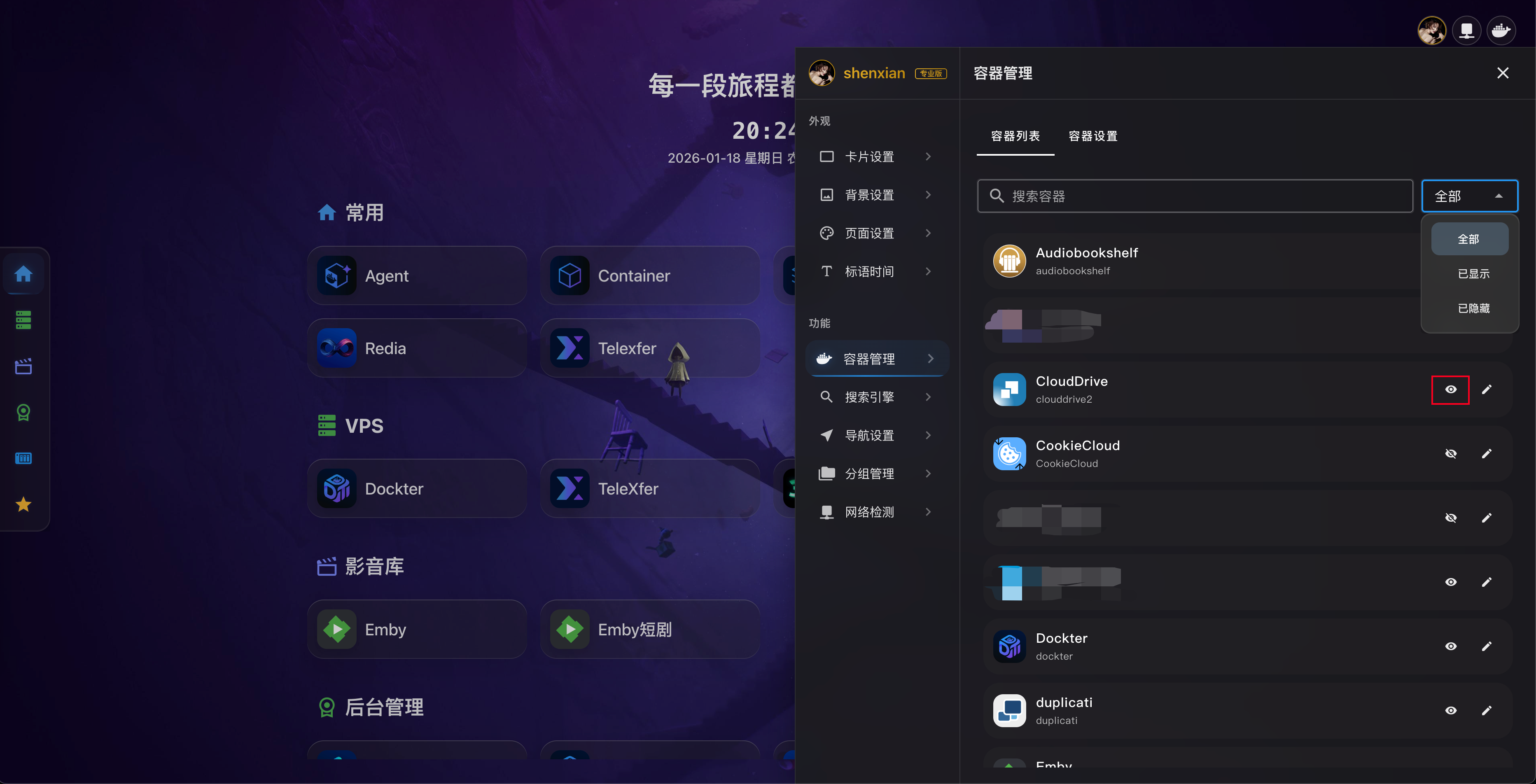 - 在容器列表中,点击眼睛图标按钮可控制容器是否在主页显示