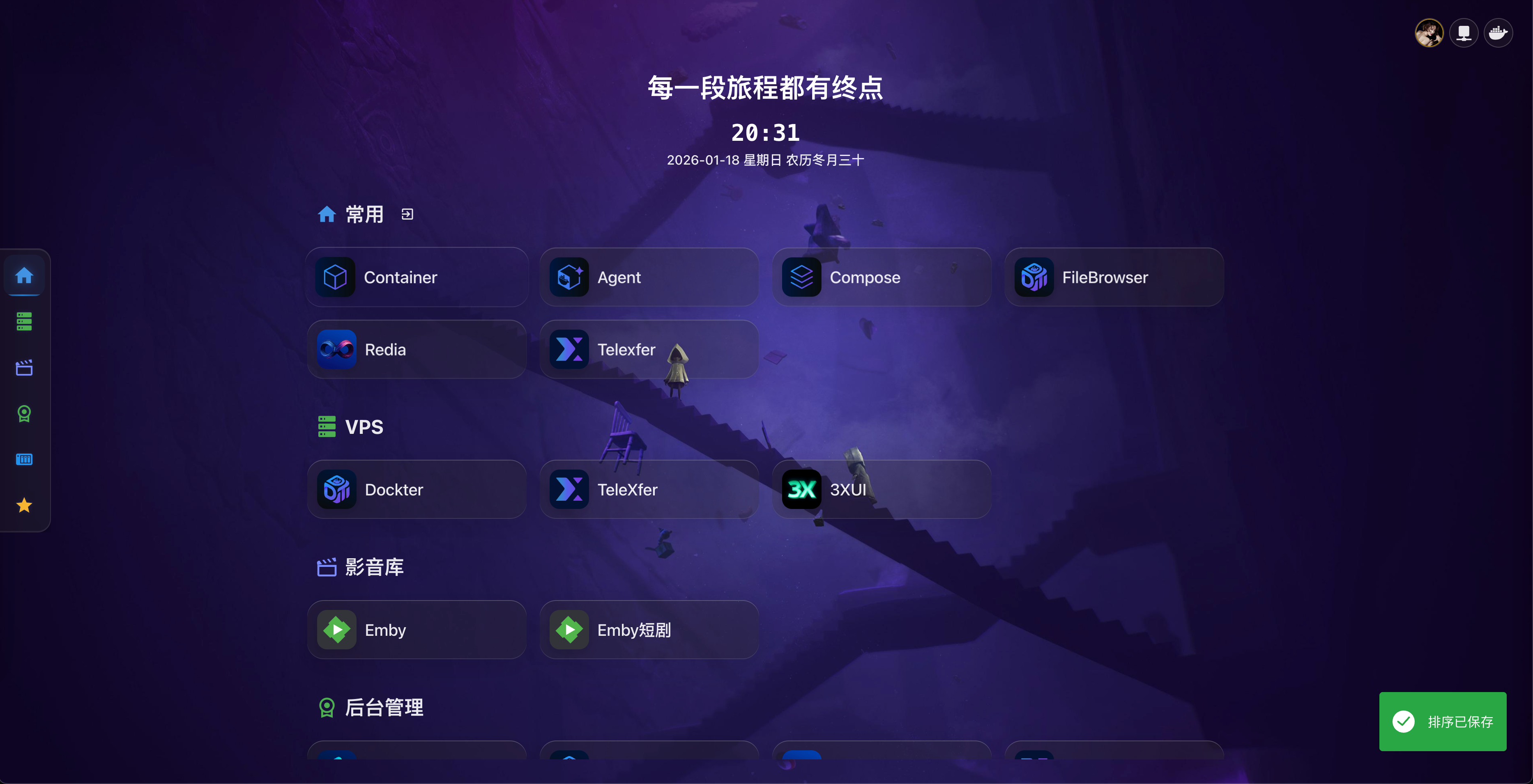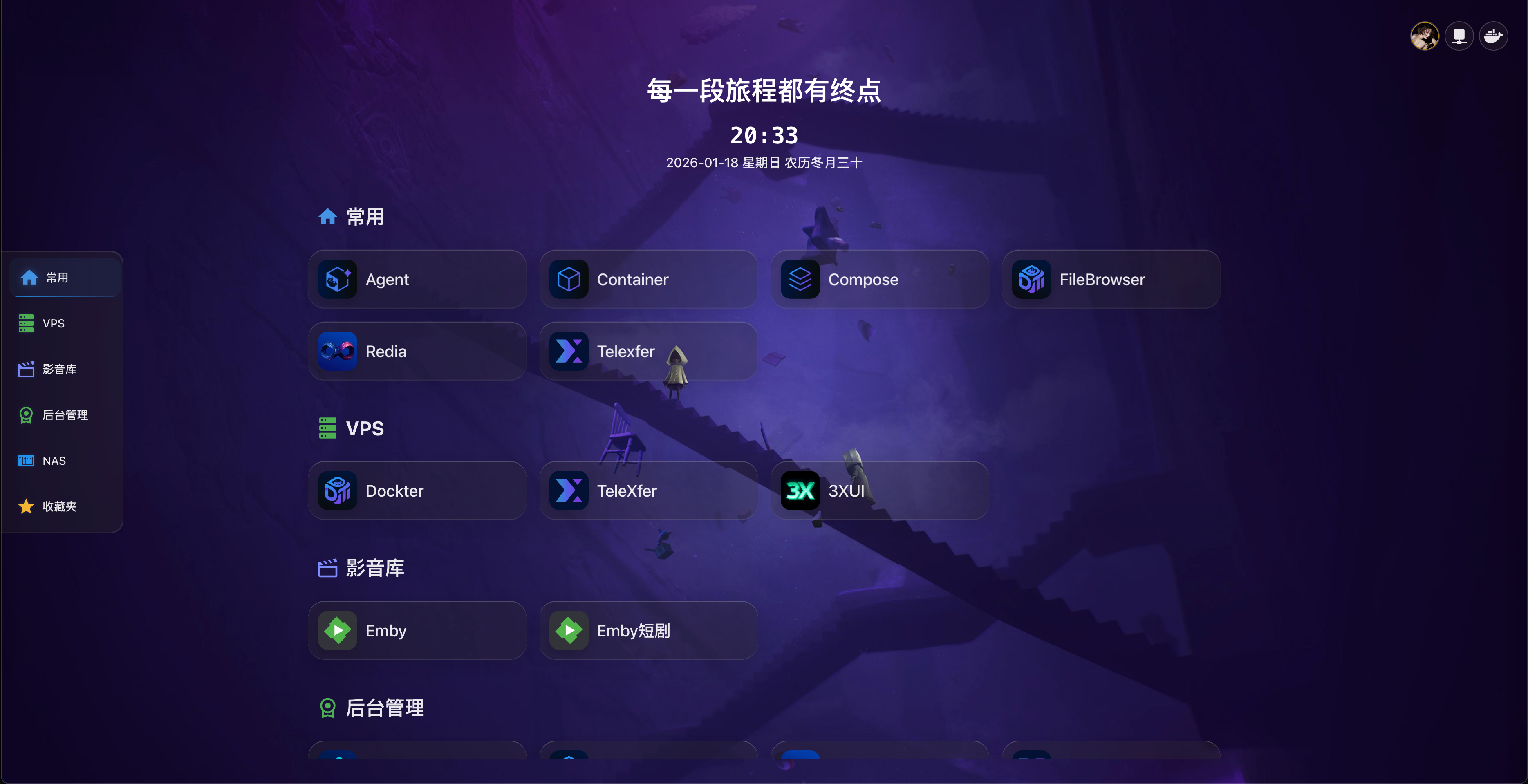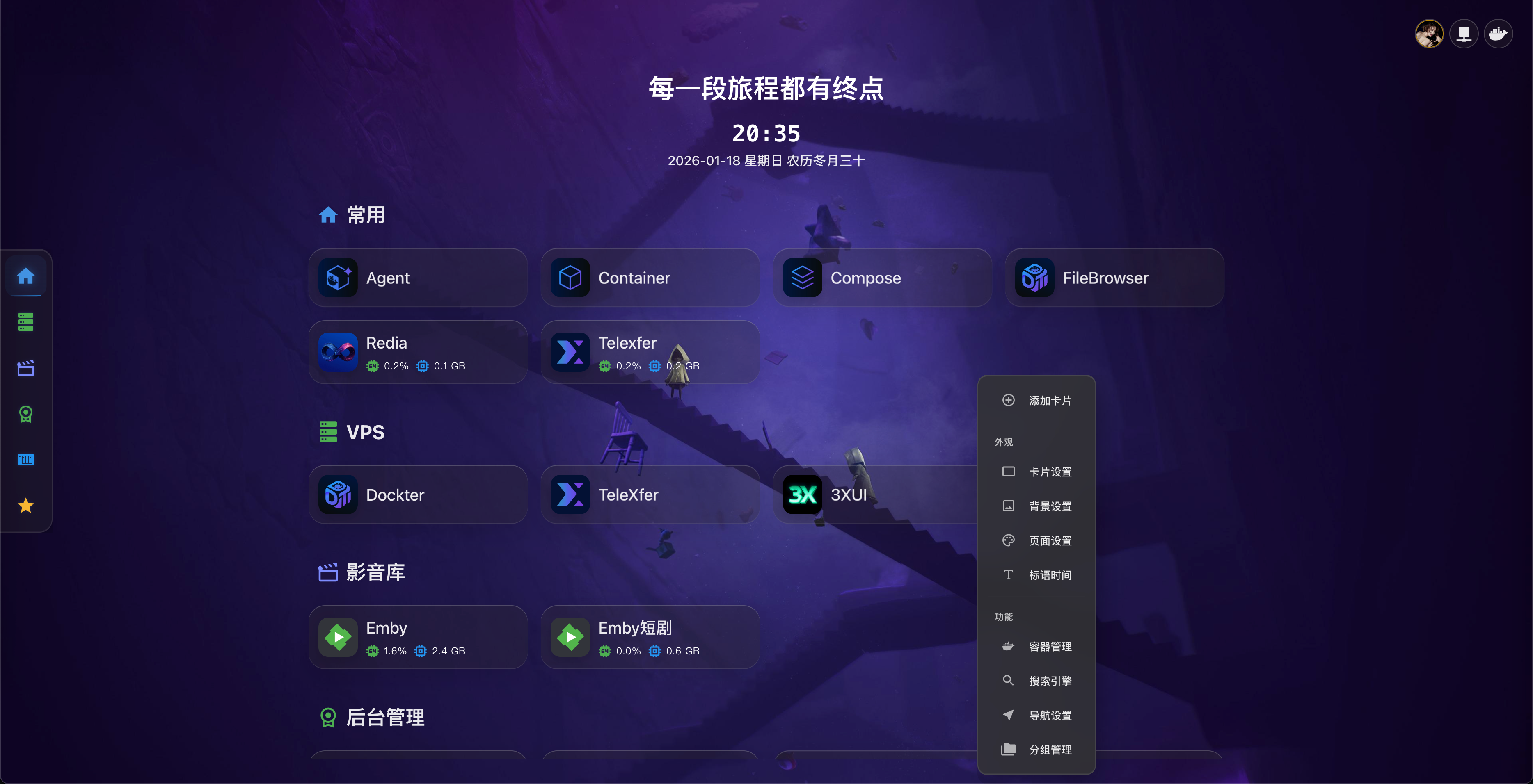 Dashboard 是 Dockter 的主页,提供了容器卡片的快速访问、系统统计、个性化设置等功能。通过 Dashboard,您可以快速访问常用容器、监控系统状态,并根据个人喜好自定义界面样式。本教程将详细介绍 Dashboard 的各项功能使用方法。