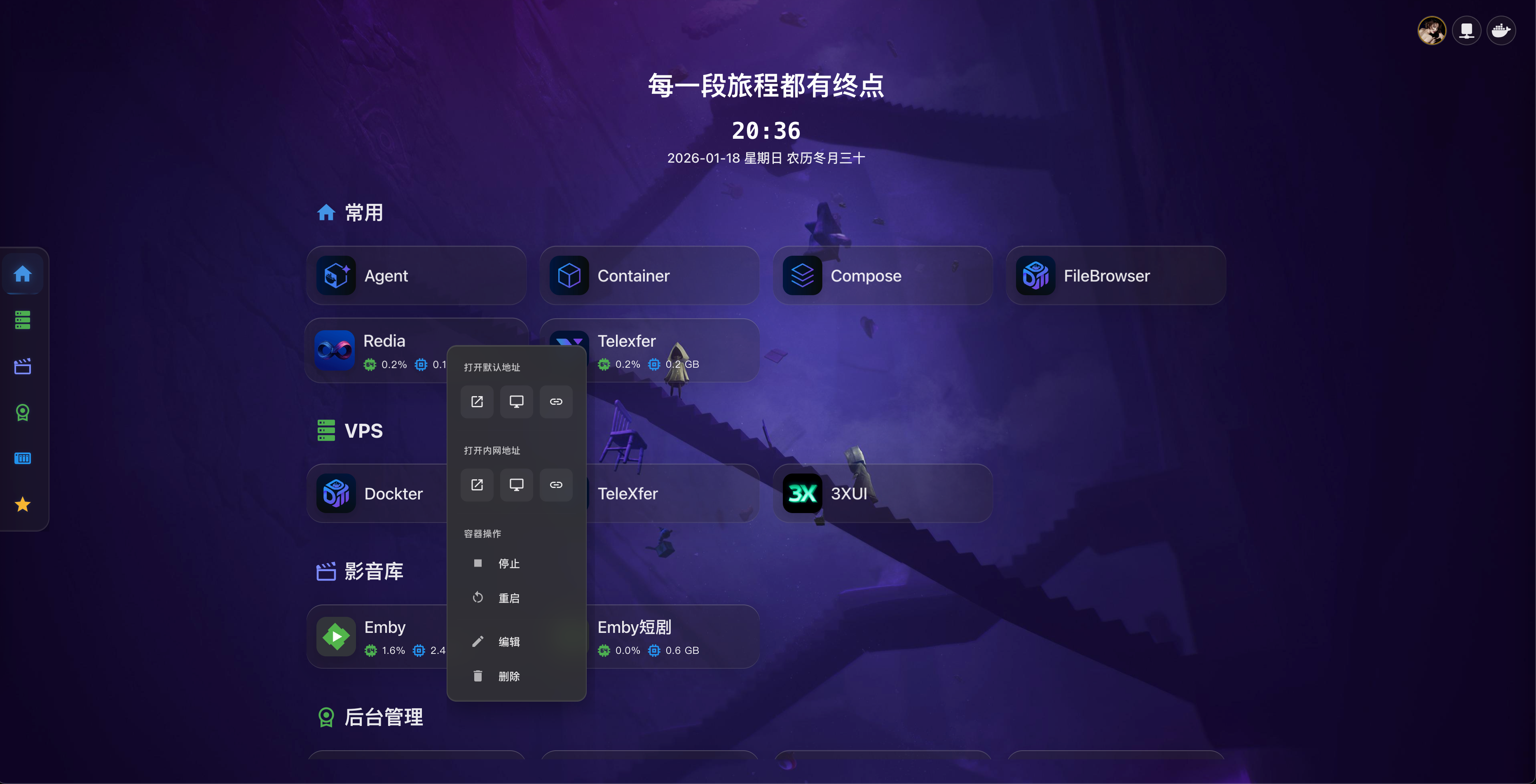 - 启动/停止/重启容器:快速执行容器操作(需要容器已配置)