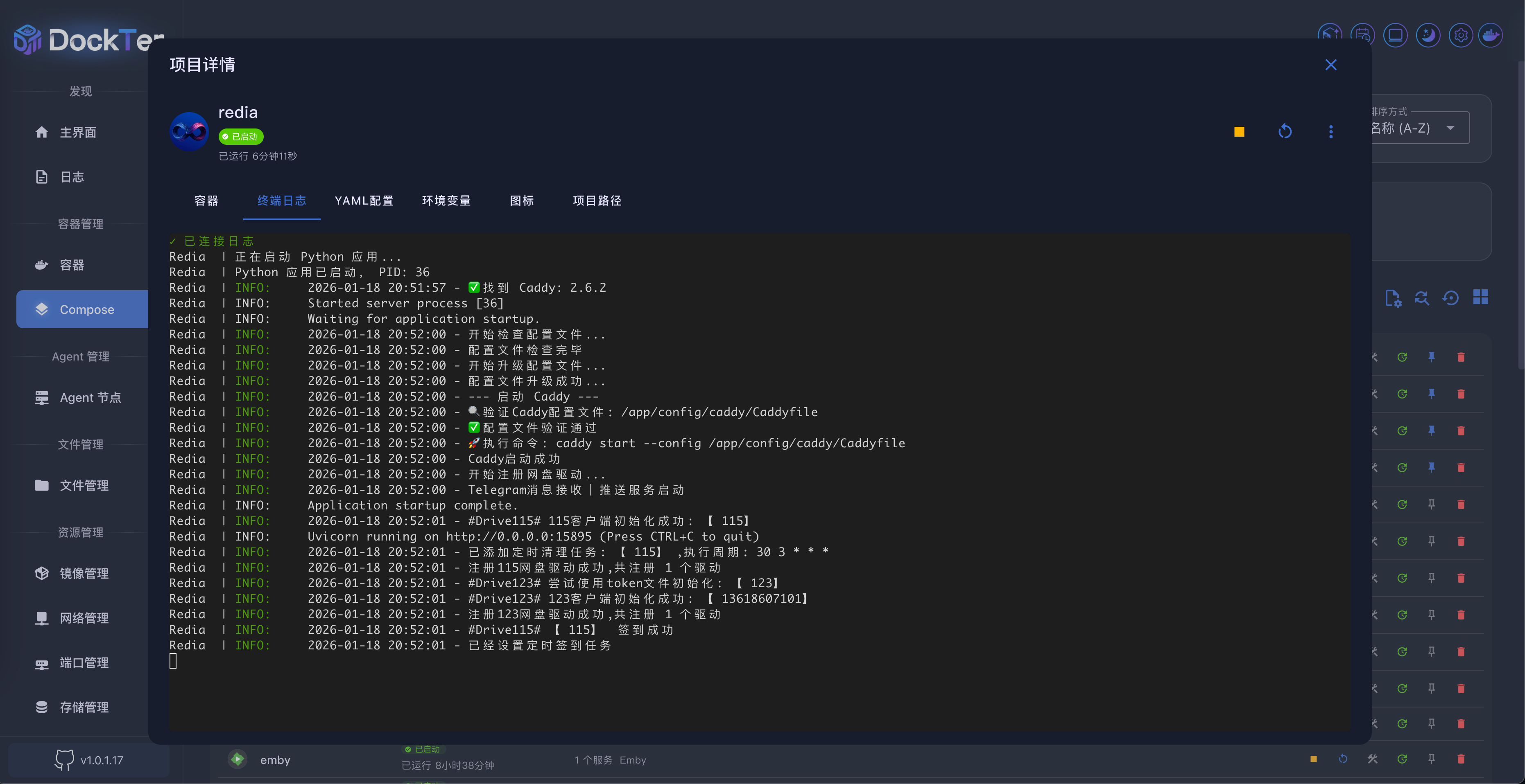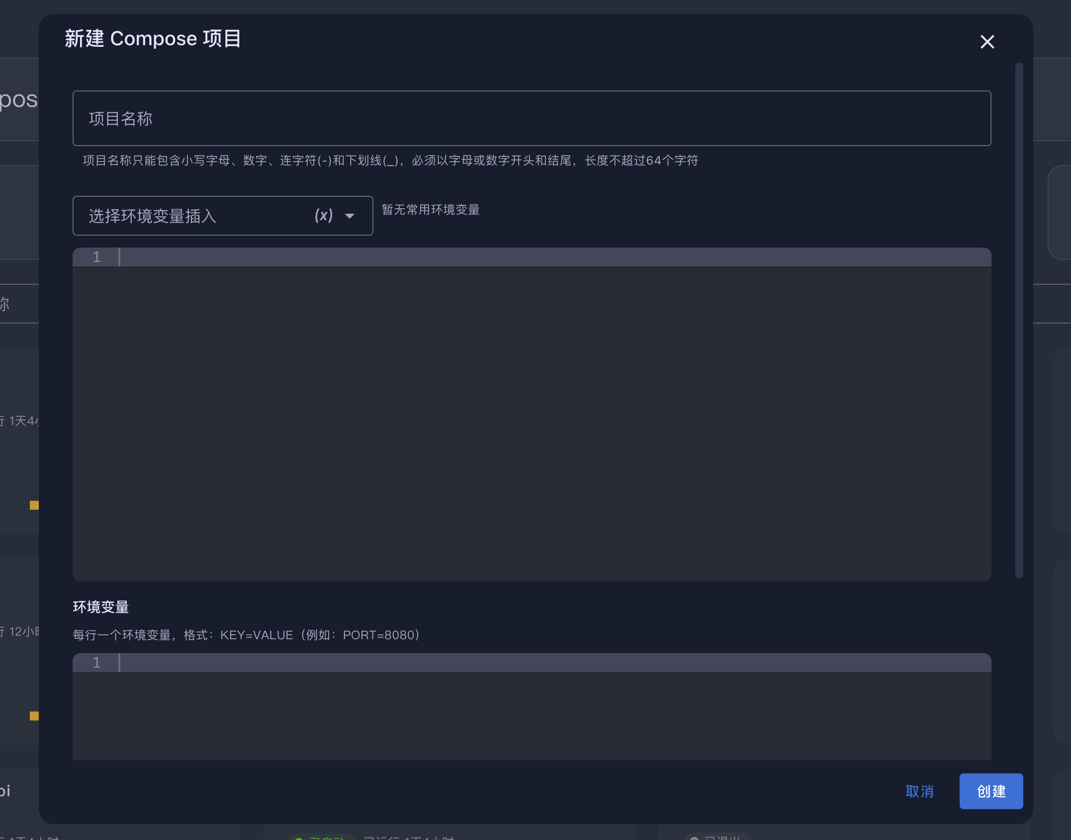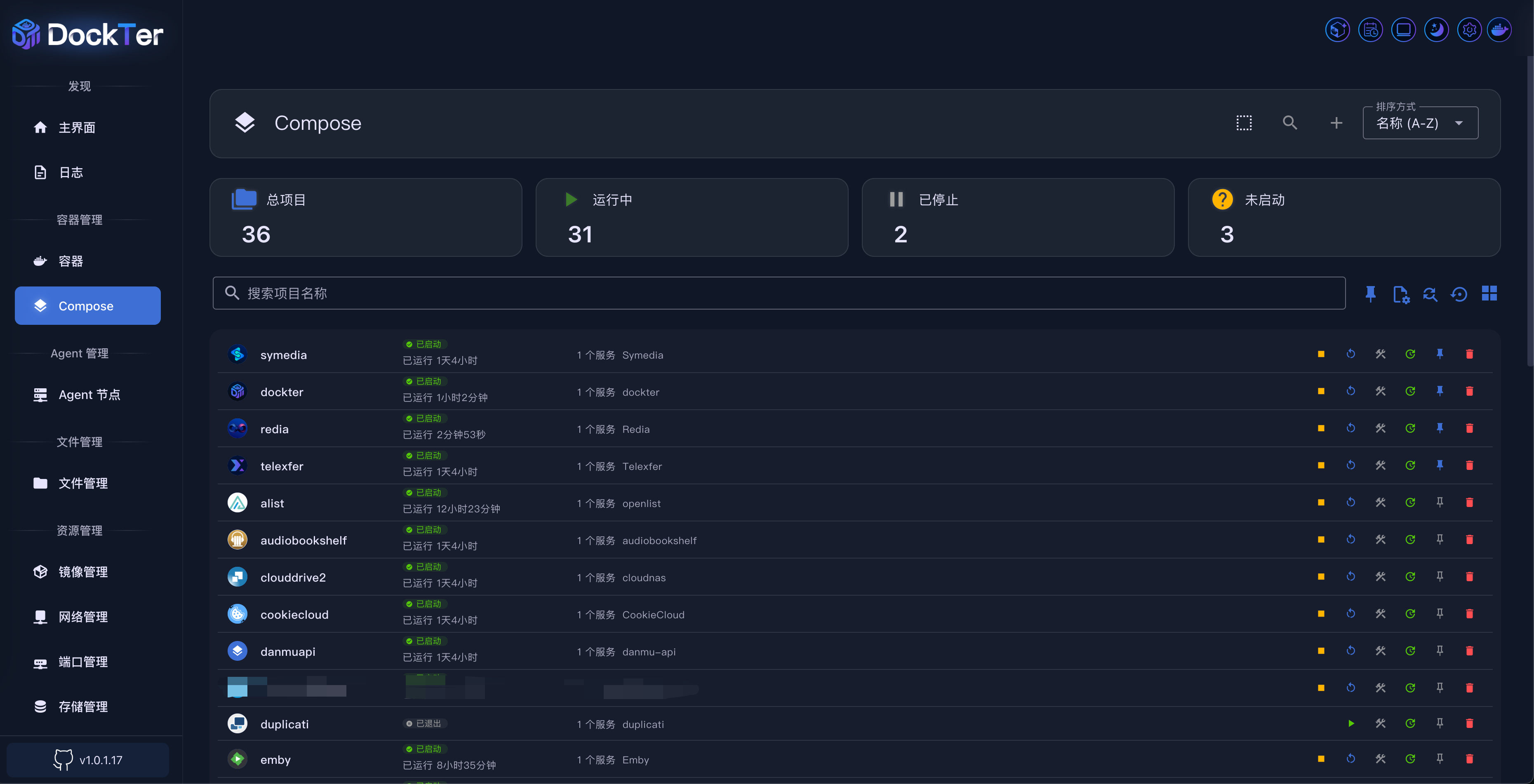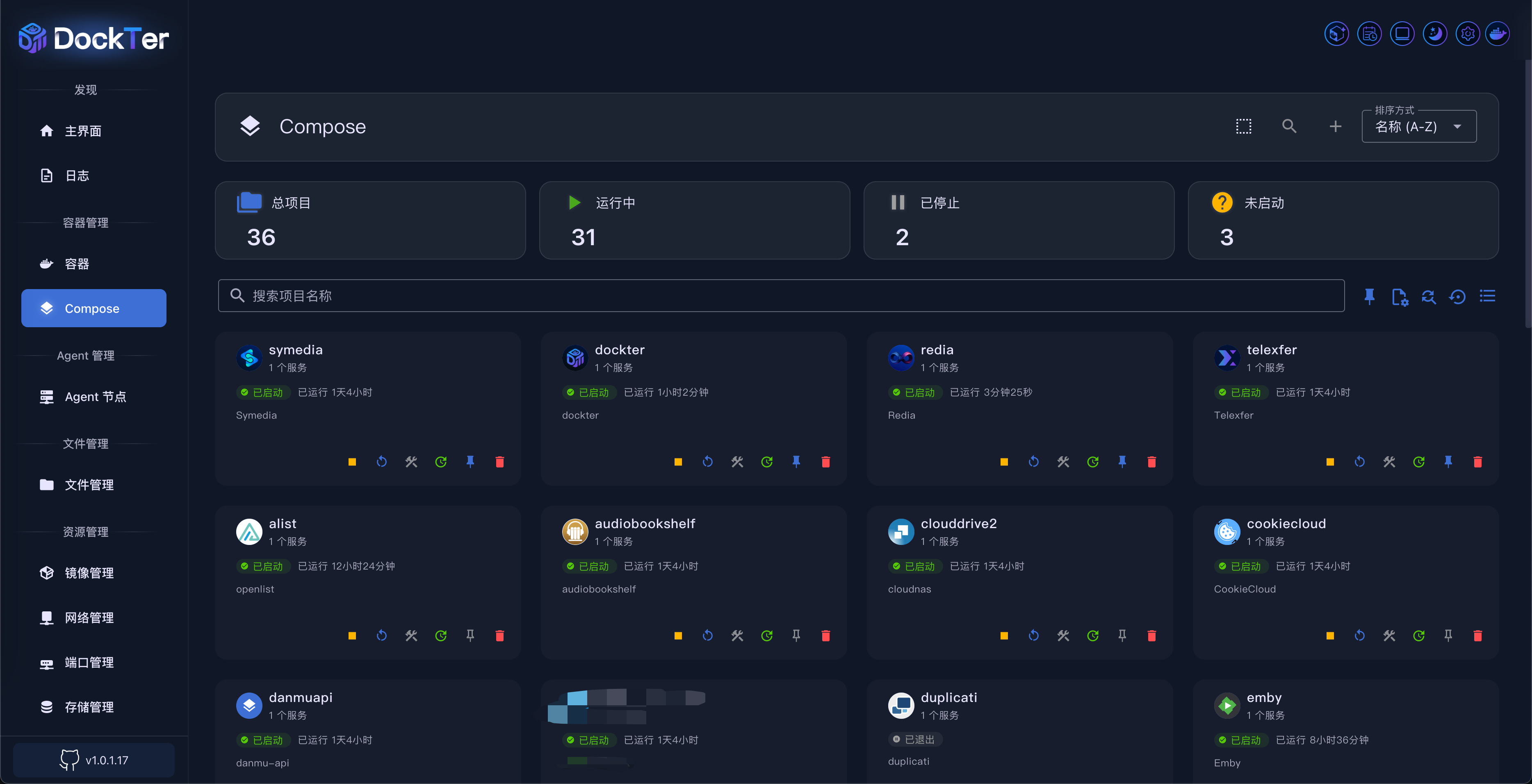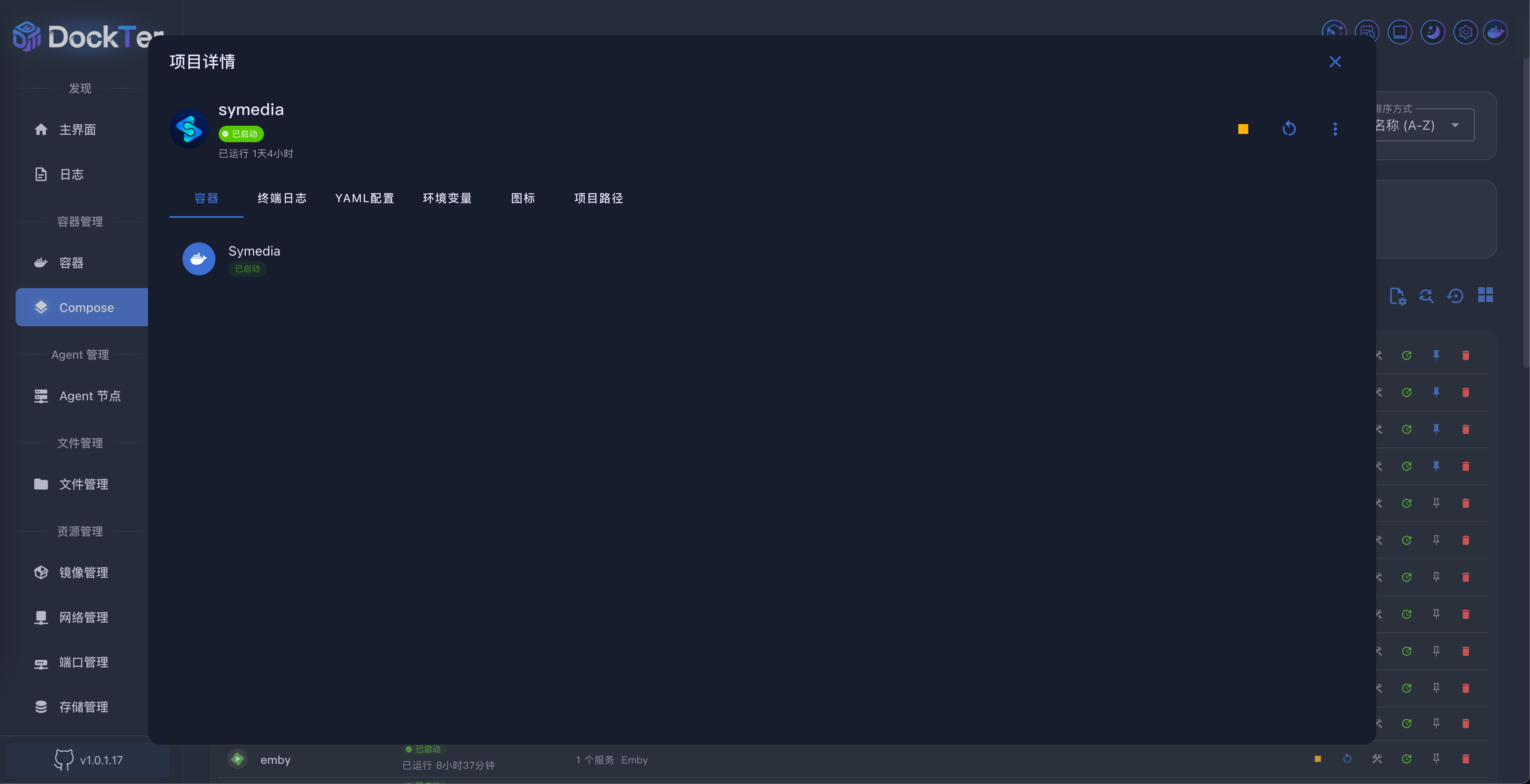 Compose 管理页面提供了 Docker Compose 项目的完整管理功能,包括项目的创建、编辑、启动、停止、监控等操作。