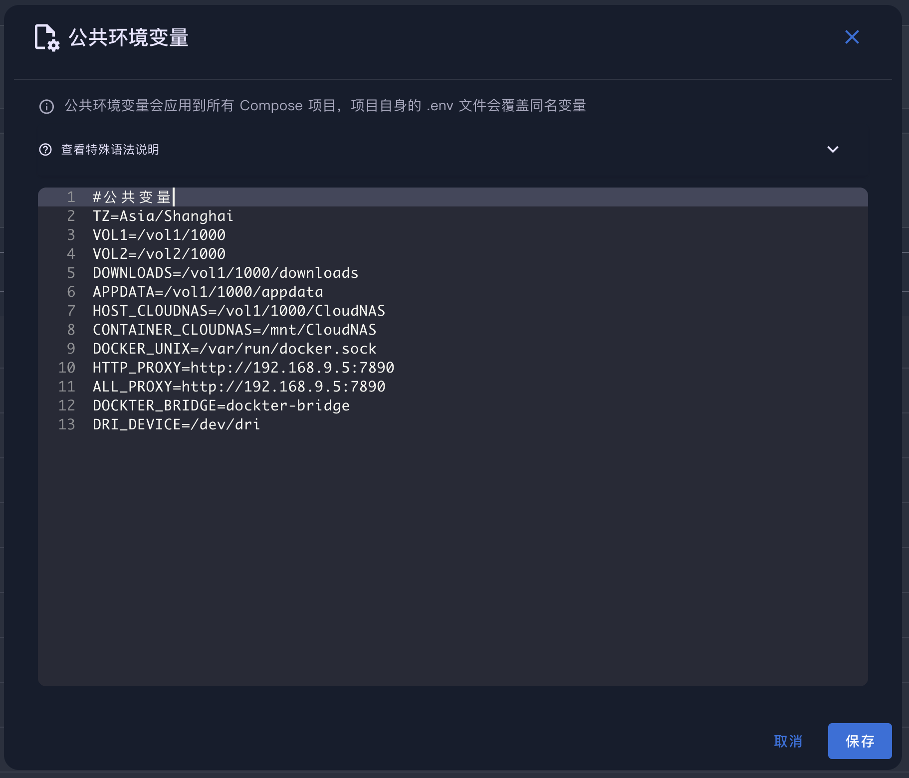 A: 公共环境变量会在所有 Compose 项目启动时自动注入,无需在每个项目中单独配置。