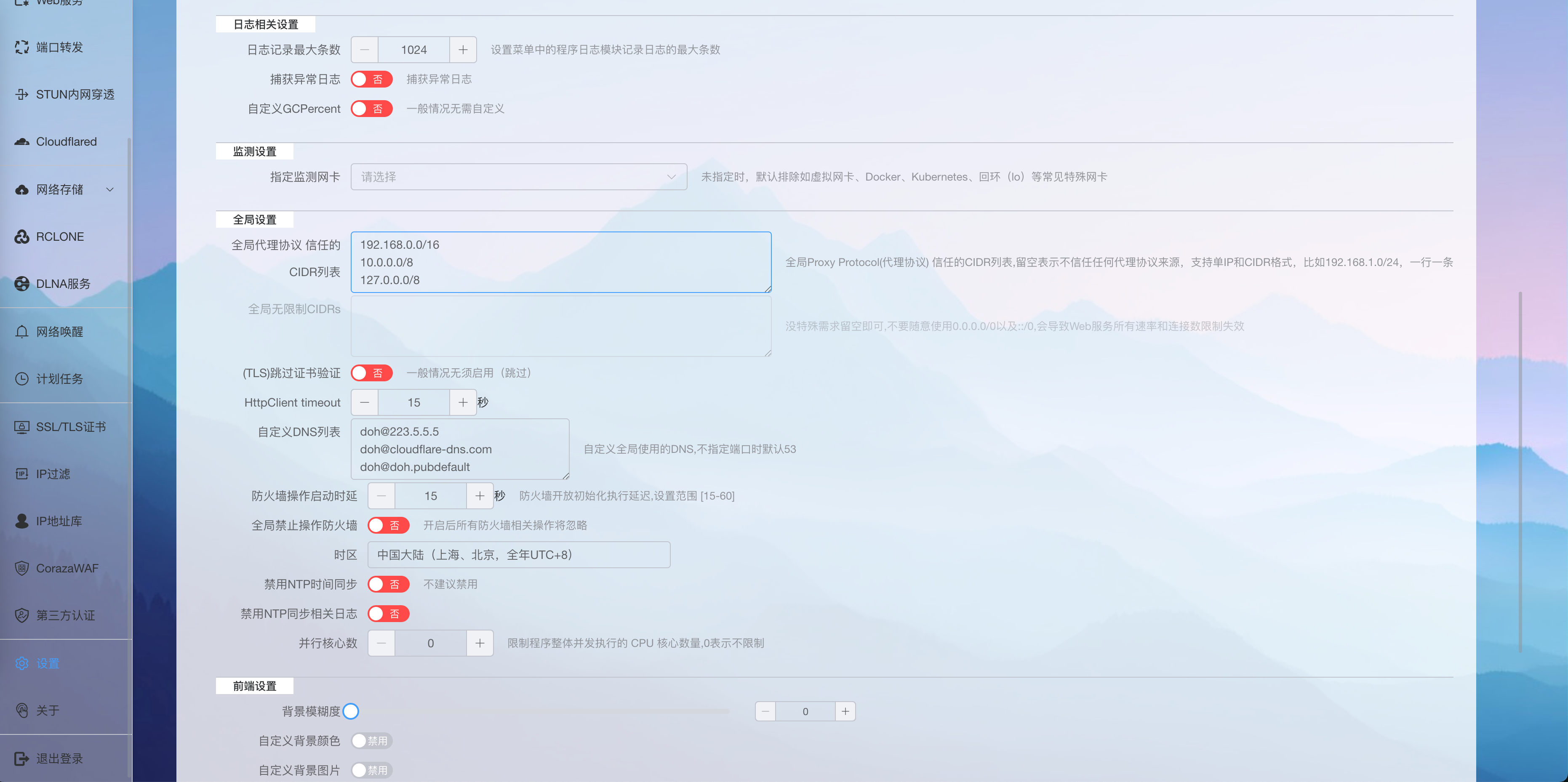 在 Lucky 中进入 设置 → 全局代理协议 → 信任的 CIDR 列表,填入以下内网地址段: